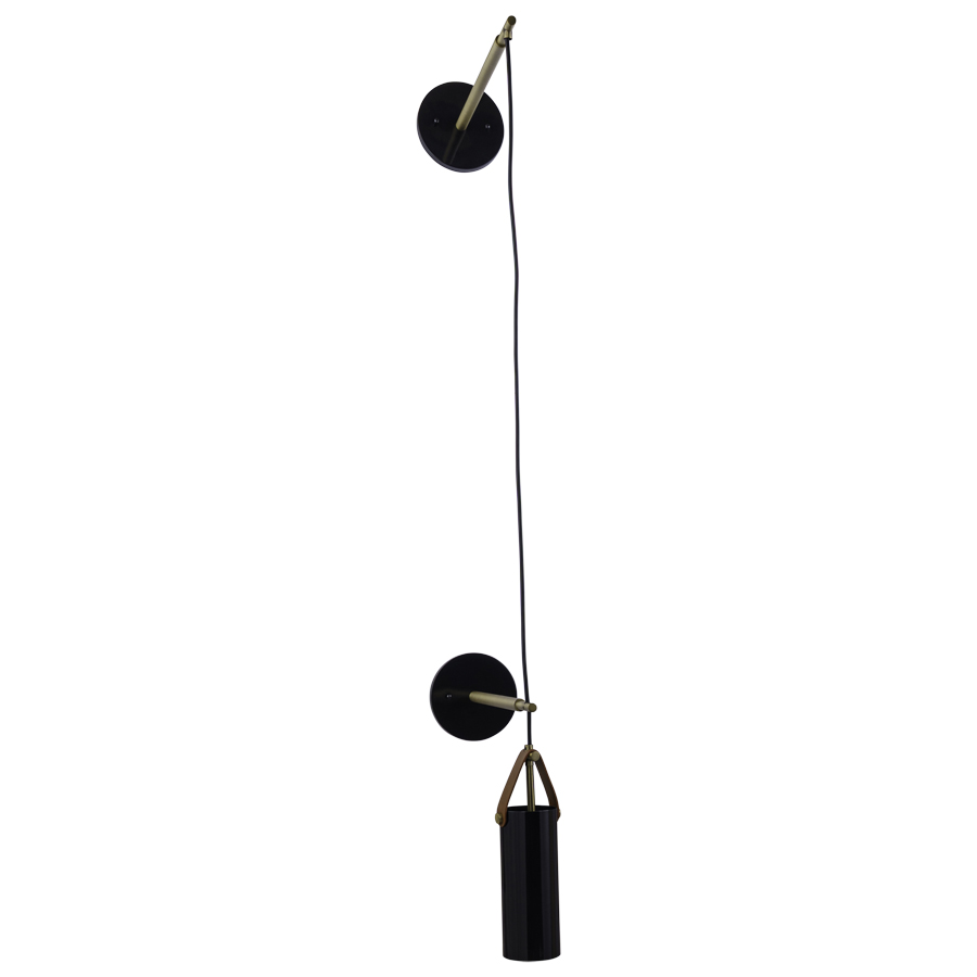53"H Powder Coat Brushed Brass and Gloss Black Wall Lamp, medium base socket, direct wired, with Gloss Black Metal Shade with Brown Leather accent piece at top, recommend 1100 lumen LED bulb