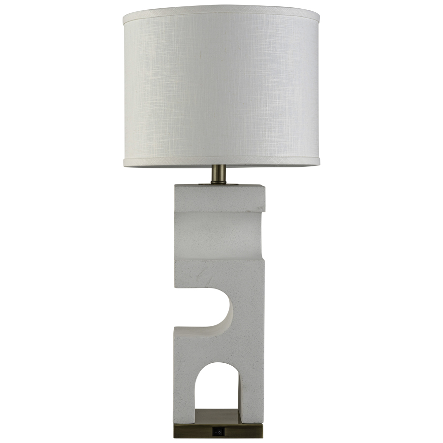 28"H Resin Faux Stone Table Lamp with Wilsonart Satin Brushed Medium Bronze accents and Satin Brushed Medium Bronze base, medium base socket, on/off rocker base switch, 10' Silver 45° cord, all metal parts have extra clear lacquer coating, 13"x13"x10" White Linen Shade with top and bottom diffusers, recommend 11 watt LED bulb