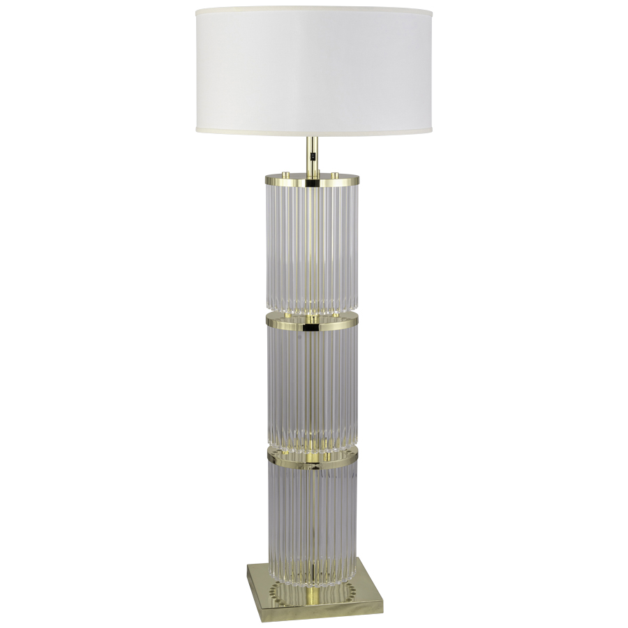 63"H Burnished Brass Floor Lamp with Clear Acrylic Rods, medium base socket, on/off rocker switch on column @ 48"AFF, 8' Silver 45° cord, 23"x23"x12" Cream Linen Hardback Shade, recommend 1100 lumen LED bulb
