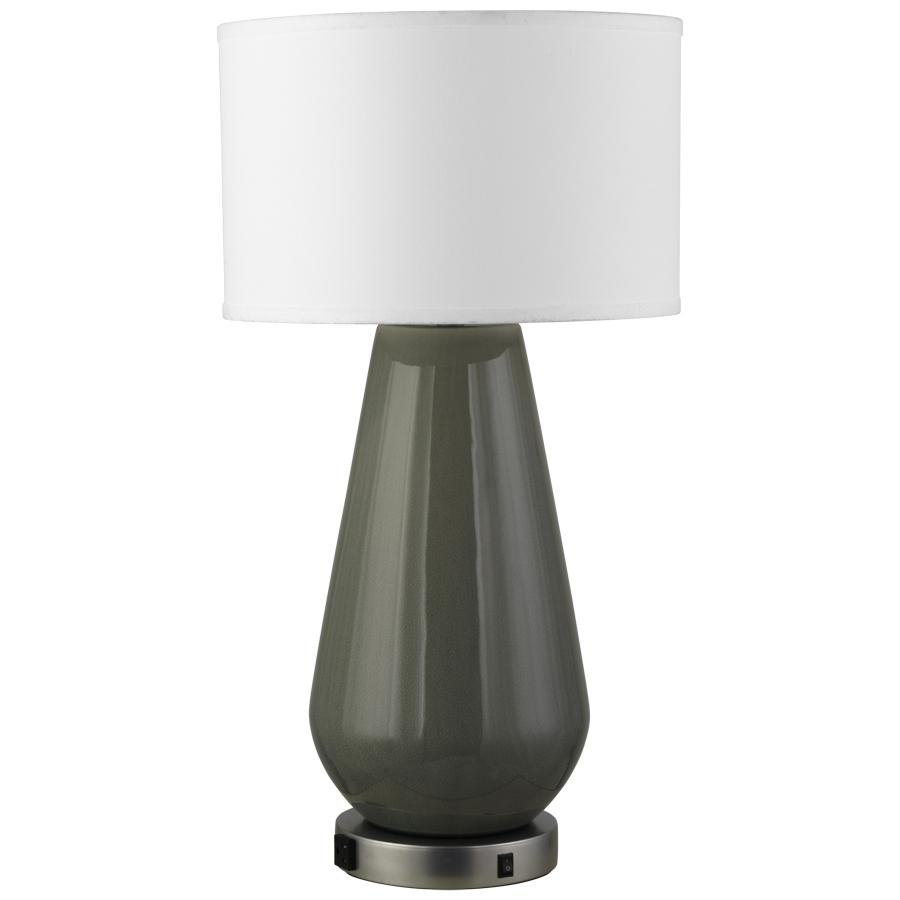 30"H Cracked Taupe Gray Resin Table Lamp with Powder Coat Brushed Nickel base, medium base socket, on/off rocker base switch, one outlet, 8' Silver 45° 3-prong grounded cord, 16"x16"x10" White Linen Hardback Shade, recommend 1100 lumen LED bulb