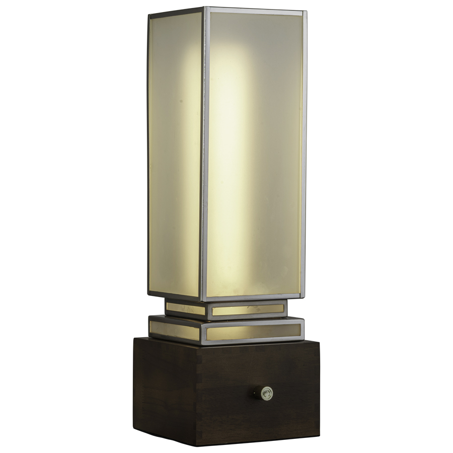 18"H Walnut Wood with dovetail joints Integrated LED Table Lamp with White Frosted Glass, 10 watt LED, 1000 lumen, 2700K, 90CRI, Bronze Rotary Dimmer switch, with bolt down, 6' Beige Fabric to match RAL1001 45° cord exiting out bottom through bolt down