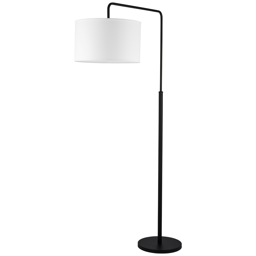 85"H Powder Coat Matte Black Floor Lamp, "S" Arm medium base socket, toggle switch on column @ 42"AFF, 8' Silver 45° cord, includes 20"x20"x12" White Linen Hardback Shade, recommend two 1100 lumen LED bulbs. Ships Knock Down. Some assembly required.