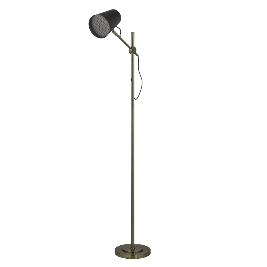 65"H Plated Antique Brass to match sample Floor Lamp, medium base socket, on/off rocker switch on column at @48"AFF, 5' Silver 45° cord, with Powder Coat Living Weathered Brass Metal Shade with Metal Perforated Mesh Bottom diffuser, recommend 800 lumen LED bulb
