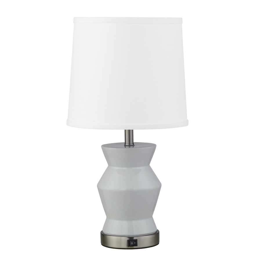 19"H White Ceramic and Brushed Nickel Table Lamp, medium base socket, on/off rocker base switch, 8' Silver 45° cord, 9"x10"x9" White Linen Hardback Shade with top acrylic diffuser, recommend 1100 lumen LED bulb