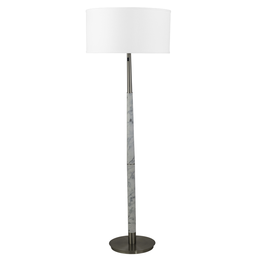 60"H Water Transfer White Marble with Subtle Gray Veining and Brushed Nickel Floor Lamp, dual medium base socket, on/off rocker switch on column @ 48"AFF, 8' Silver 45° cord, 20"x20"x10" White Linen Hardback Shade with bottom acrylic diffuser, recommend two 800 lumen LED bulbs
