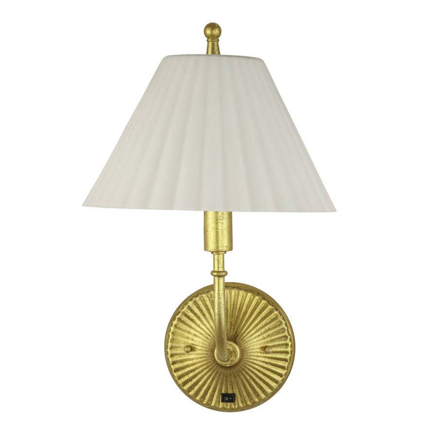 16.5”H Gold Leaf Wall Lamp, E12 socket, on/off rocker switch at backplate, 6’ silver 45º cord exiting out back of lamp, Satin White Pleated Glass Shade, recommend 5 watt candelabra LED bulb
