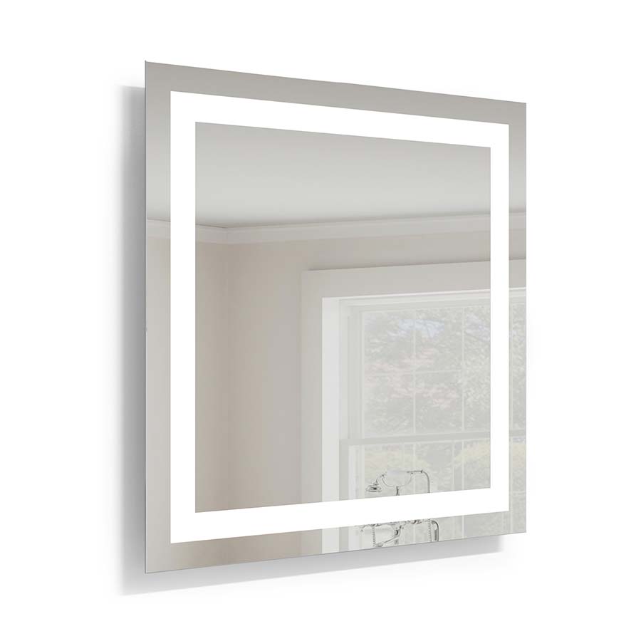 36"W x 36"H 5mm copper free silver mirror with safety backing, 2" Frosted Panels inlay all around mirror, Single 2835 LED Strip, 54 watt, 5400 lumen, 4000K, 110-120V, 50/60Hz, White powder coated steel chassis, with cord and plug