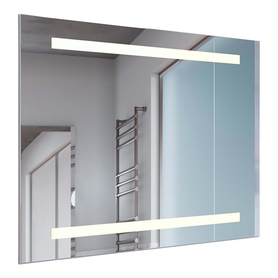 Edit48"W x 36"H LED Lighted Mirror with 1.5" Frosted Panels inset at top and bottom, White Powder coated steel chassis, Double rows LED Strips, 25 watt, 2620 lumen, 3000K, 90CRI, 110-120V, with cord and plug