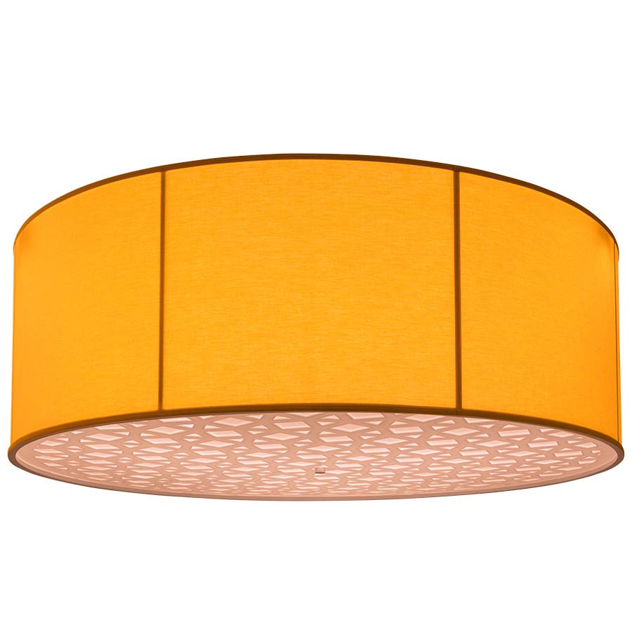60x60x20 LED Pendant, shown in gold fabric,15.6 watt, 3000K. 2,400 lumens, Brushed Nickel Canopy, with laser cut weave pattern bottom diffuser