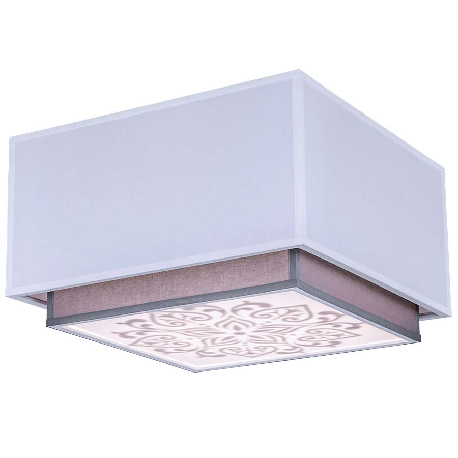 Two Tier Square Pendant with White Linen Outer Shade, Kona Pewter Inner shade, Brushed Nickel accents, 4 medium sockets, direct wired. Outer shade is 24"W x24"Lx12"H, inner shade is 20"Wx20"Lx14"H, bottom etched diffuser. Recommend 4-1100 lumen LED bulbs
