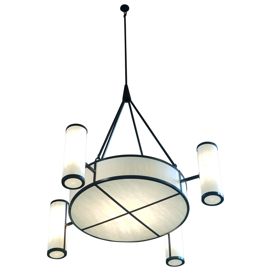 1-Tier Chandelier Pendant with Center Drum and 4 Side Cylinders, Pottery Bronze Finish, Alabaster Acrylic, with Down Rod Suspension and Hang-Straight, 81"D x 24"H Frame, Integrated LED, 120-277V Input, 12000 Lumens, 140 W, 3000K, 80 CRI, 0-10V Dimmable, Direct Wired