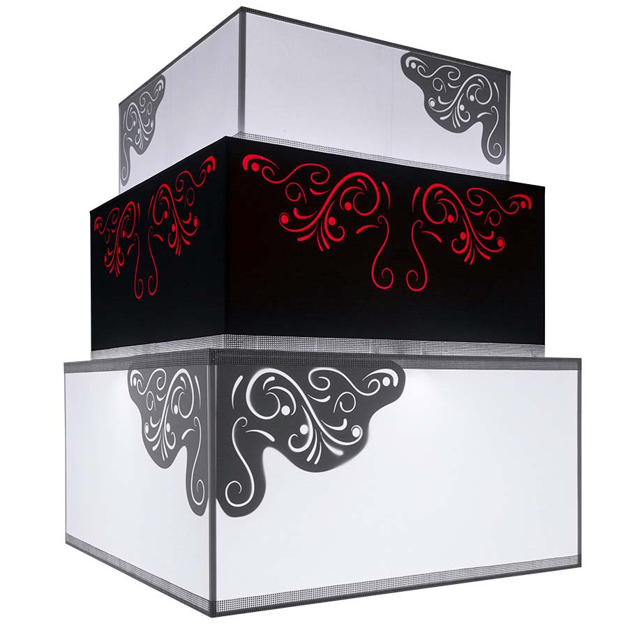 48x48x25/42x42x20/36x36x14; 3 Tier LED Pendant,124.8 Watts,19200 lumens, 3000K, 48 x25 Filigree Shadow behind White LinenTop, 42x20 Red & Black with filigree cutout Middle. 36x14 Filigree Shadow behind White Linen Bottom. 2-down rods, bottom diffuser