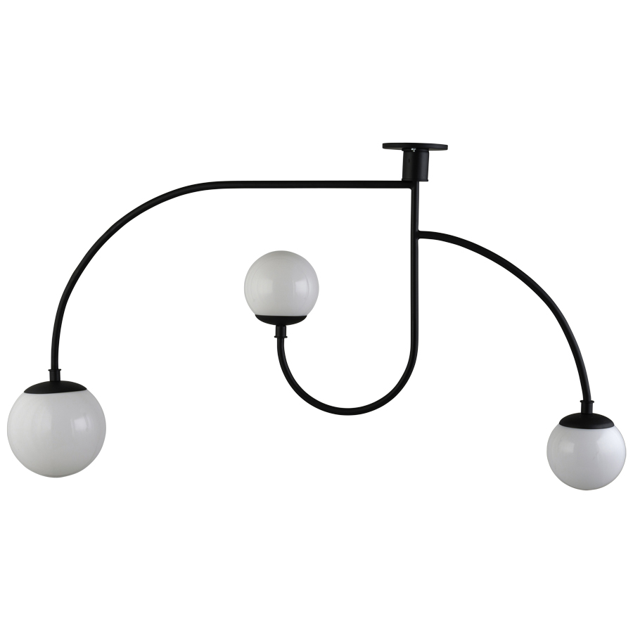 Matte Black ceiling mount light fixture with 3 curved arms, with 3 white acrylic globes on the ends of the arms, direct wire, with 1 G9 socket in each globe