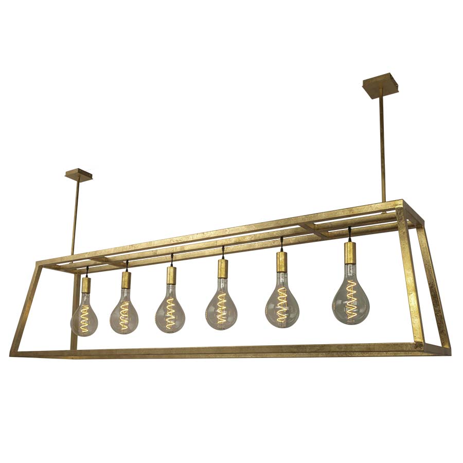 Rectangle Frame Pendant made of 1.25" Square Tube, Six E26 Bulbs, 22.50" Down rod Suspension and a Gold Leaf Finish, recommend six 4 watt Grand Shaped Amber Filament bulbs
