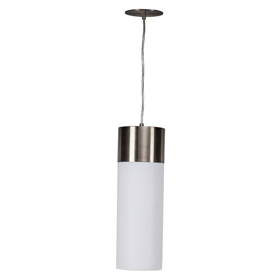 Brushed Nickel Pendant, medium based socket, direct wired, cord hung, variable height up to 10', lamp body is 17.5"Hx5"W. White Frosted Acrylic diffuser, 5 Year warranty on lighting components. Made in USA.