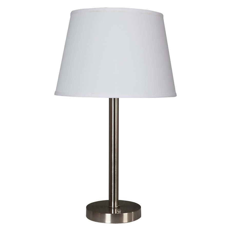 25.5" Brushed Nickel Table Lamp, medium base socket, on/off push button base switch, 8' Silver 45° cord, 11"x15"x10" White Linen Hardback Shade, recommend 1100 lumen LED bulb