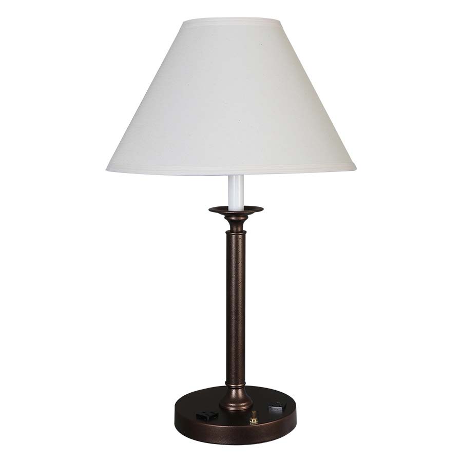 25" Powder Coat Liberty Bronze Table Lamp, medium base socket, on/off push button base switch, 8' Silver 45° cord, 6x16x10 1/2 Natural Linen Hardback Shade. Recommend 1100 lumen LED bulb.
