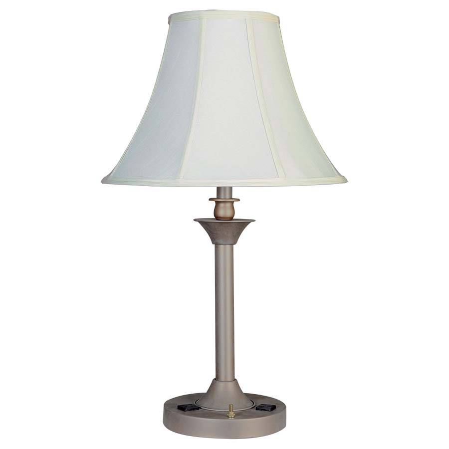 27" Table Lamp shown in Pewter Gold, medium base socket, on/off push button base switch, 8' Silver 45° 3-prong grounded cord, two outlets. Includes 7"x16"x11.5" Cream Faux Silk Softback Shade. Recommend 1100 lumen LED bulb.