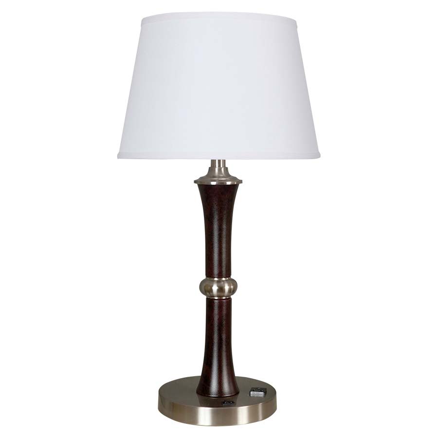 26" Dark Acacia Wood Table Lamp, medium base socket, on/off rocker base switch, 8' Silver 45° 3-prong grounded cord, one outlet. Includes 10"x14"x9" Cream Linen Hardback Shade. Recommend 1100 lumen LED bulb. (finish not shown in picture)