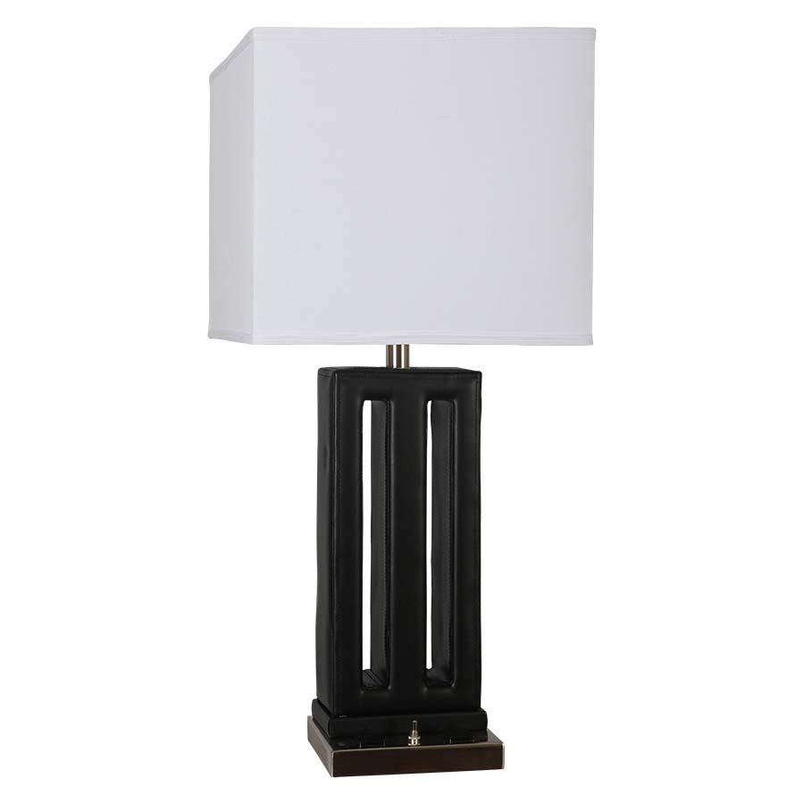 29" Black Faux Leather and Brushed Nickel Table Lamp, medium base socket, on/off rocker base switch, 8' Silver 45° 3-prong grounded cord, one outlet, 12"x12"x12"x12"x10" White Linen Hardback Shade. Recommend 1100 lumen LED bulb.