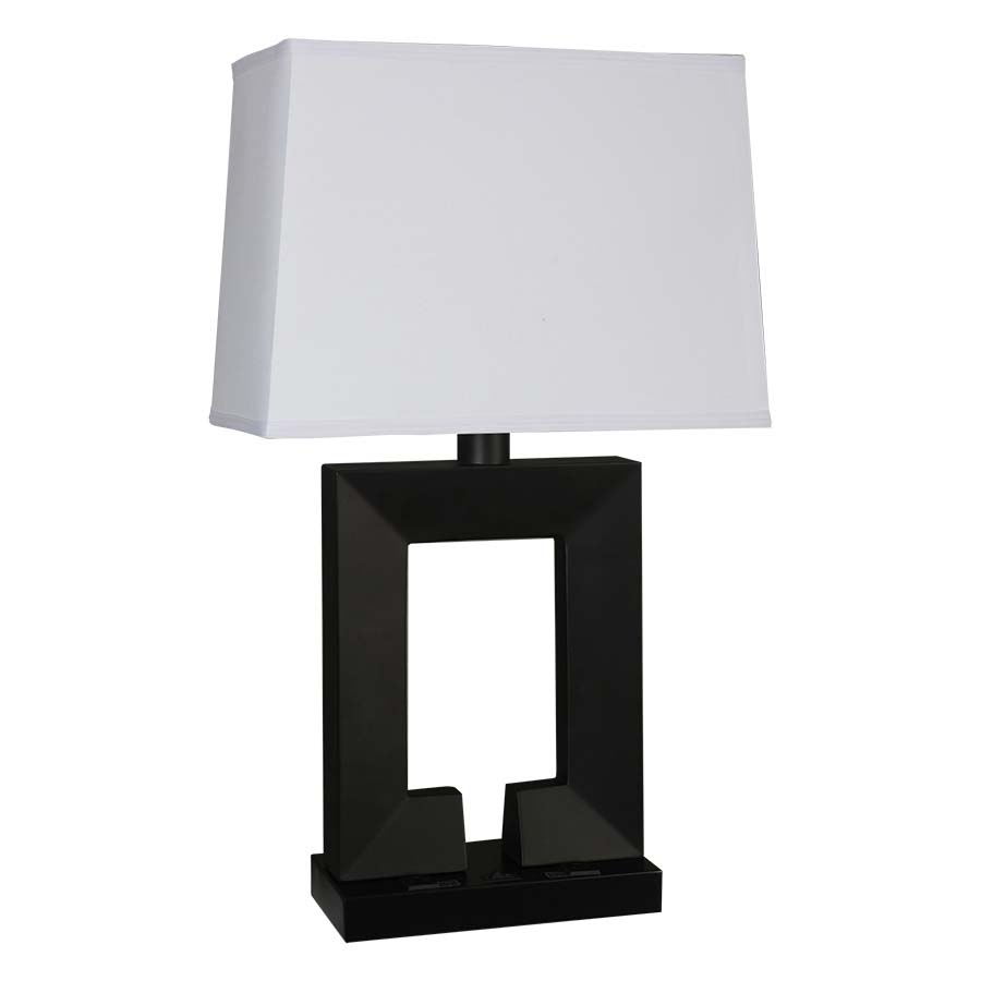 28" Old Espresso and Black Base Table Lamp, medium base socket, on/off rocker base switch, 8' Silver 45° 3-prong grounded cord, two outlets. 9"x14"x10"x16"x10" Cream Linen hardback shade. Recommend 1100 lumen LED bulb.