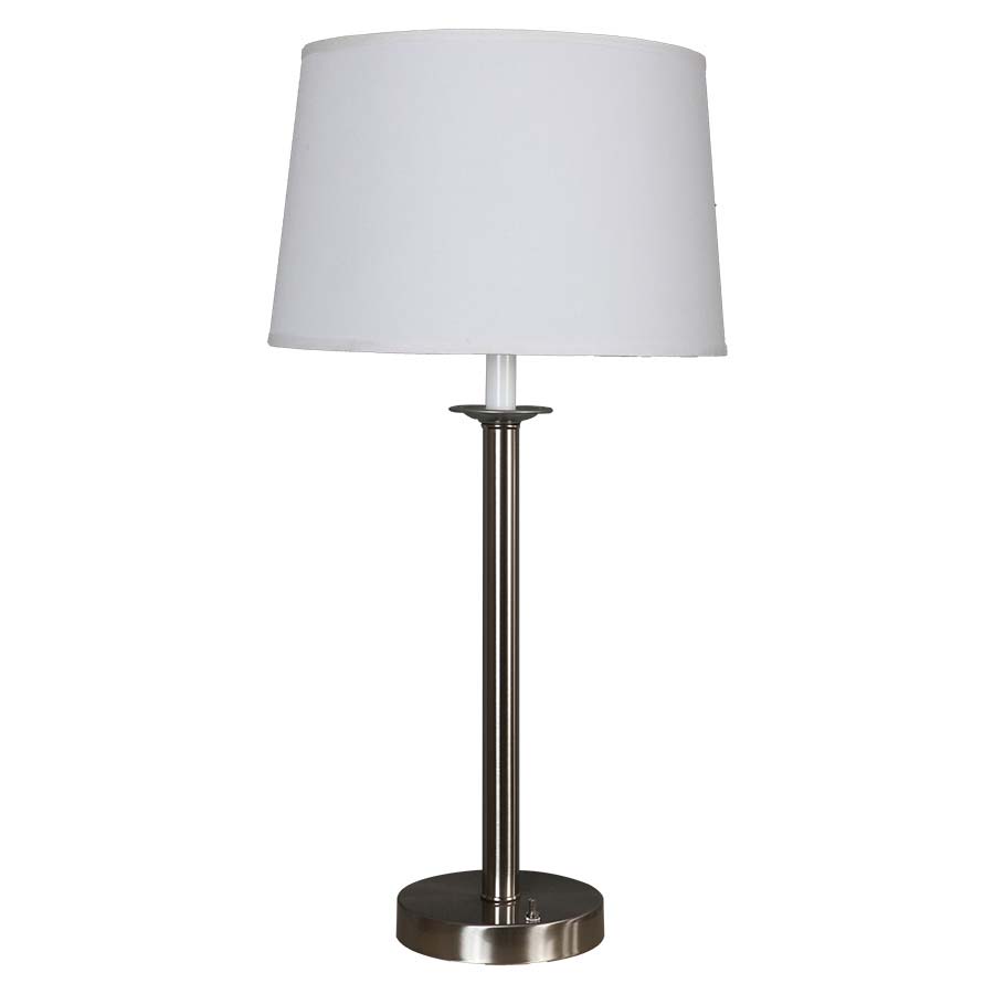 29.25" Brushed Nickel Table Lamp, medium base socket, push button base switch, 8' Silver 45° cord, 13"x16"x10" White Linen Hardback Shade. Recommend 1100 lumen LED bulb.