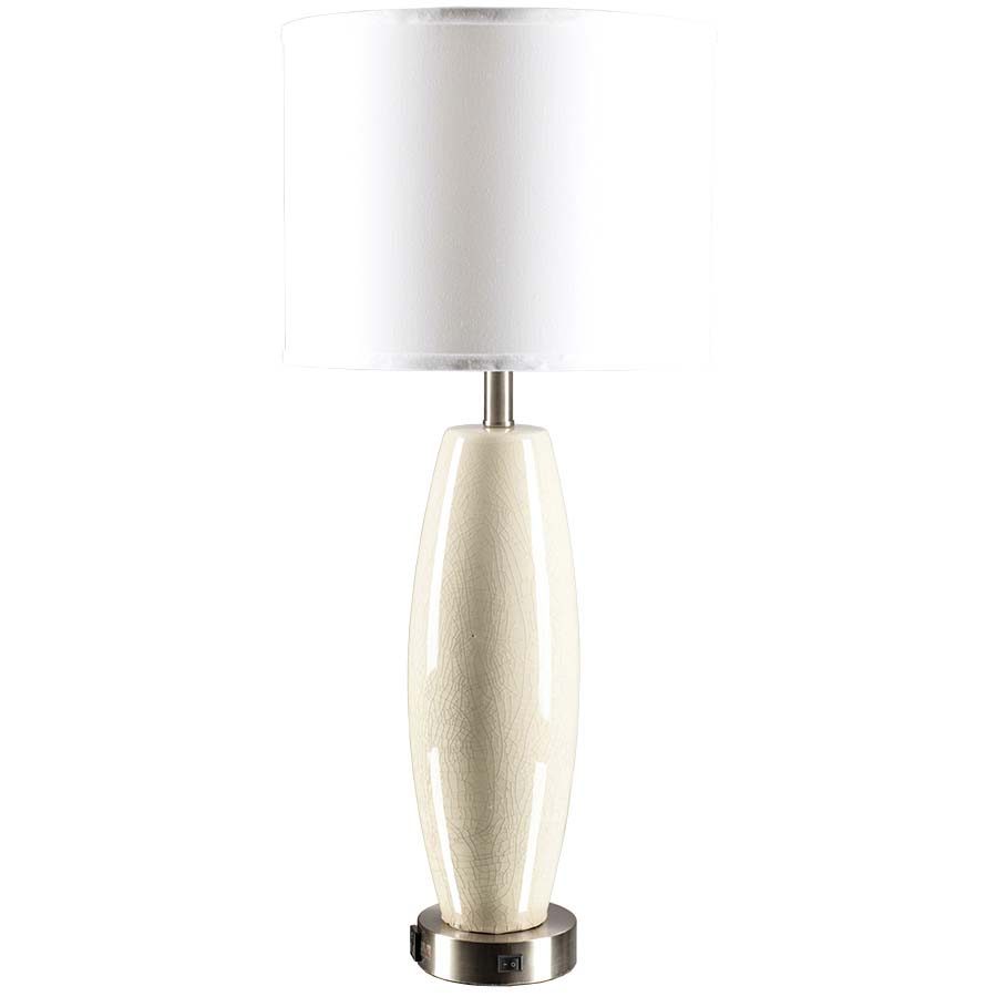 32.5"H Eggshell Crackle and Brushed Nickel Table Lamp, GU24 socket, on/off rocker base switch, one convenience outlet, 8' Silver 45° 3-prong grounded cord, 14x15x12 Natural Linen Hardback Shade. Recommend 1100 lumen LED bulb with GU24 Base.