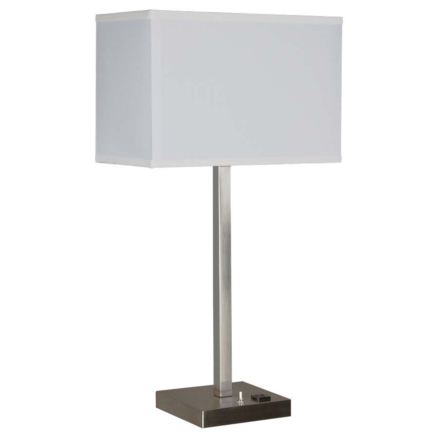 28"H Brushed Nickel Table Lamp, medium base socket, on/off push button base switch, with one convenience outlet, 8' Silver 45° 3-prong grounded cord, with 8"x15"x8"x15"x10" Rectangle White Linen Hardback Shade. Recommend 1100 lumen LED bulb.