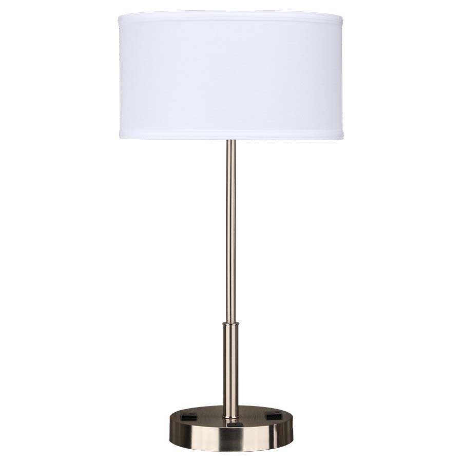27" Brushed Nickel Table Lamp, dual medium base socket, dual on/off rocker switch at base, two convenience outlets, 8' Silver 45° 3-prong grounded cord, 14x14x8 White Linen Hardback shade. Recommend two 800 lumen LED bulbs.