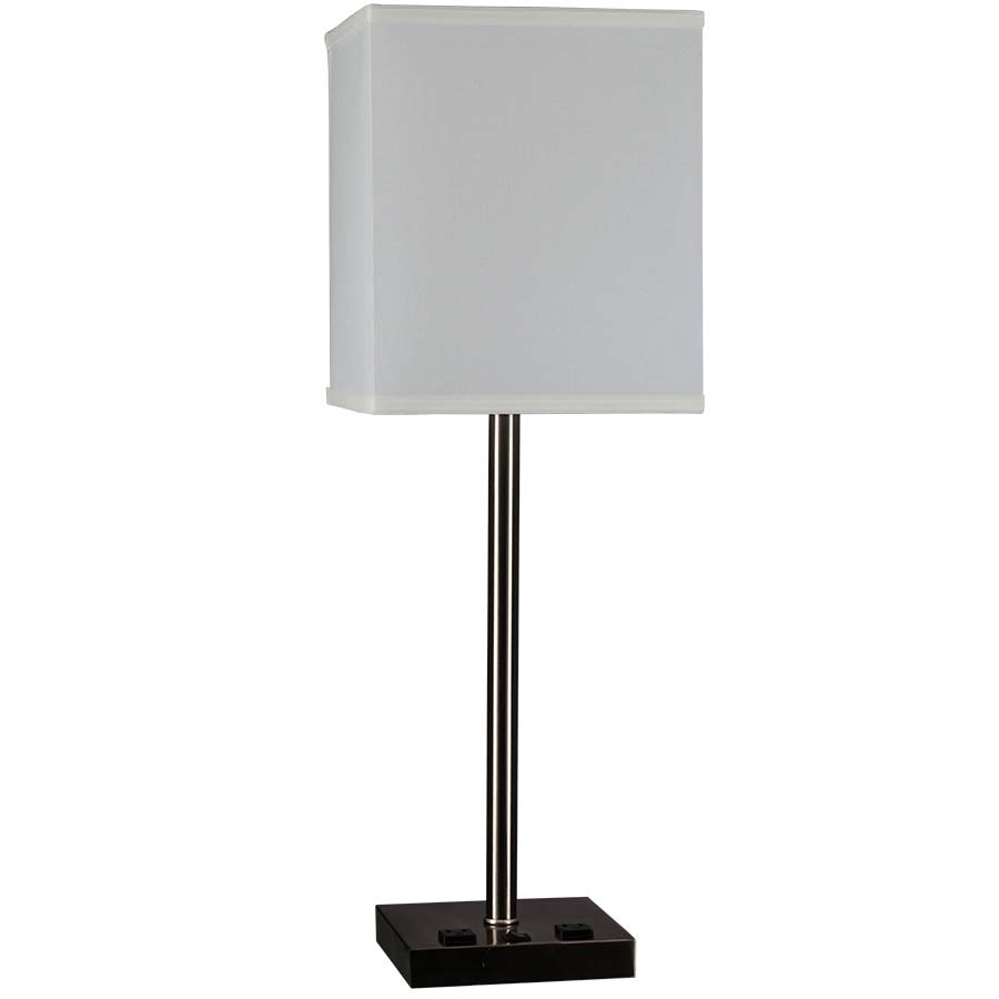 29.25"H Brushed Nickel Table Lamp, medium base socket, on/off rocker base switch, 8' Silver 45° 3-prong grounded cord, two convenience outlets, 10"x10"x10"x10"x12" White Linen Hardback Shade, recommend 1100 lumen LED bulb