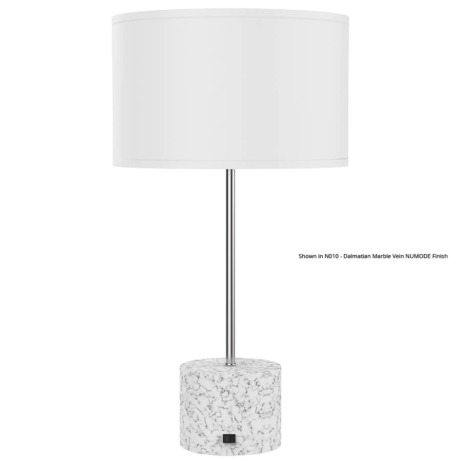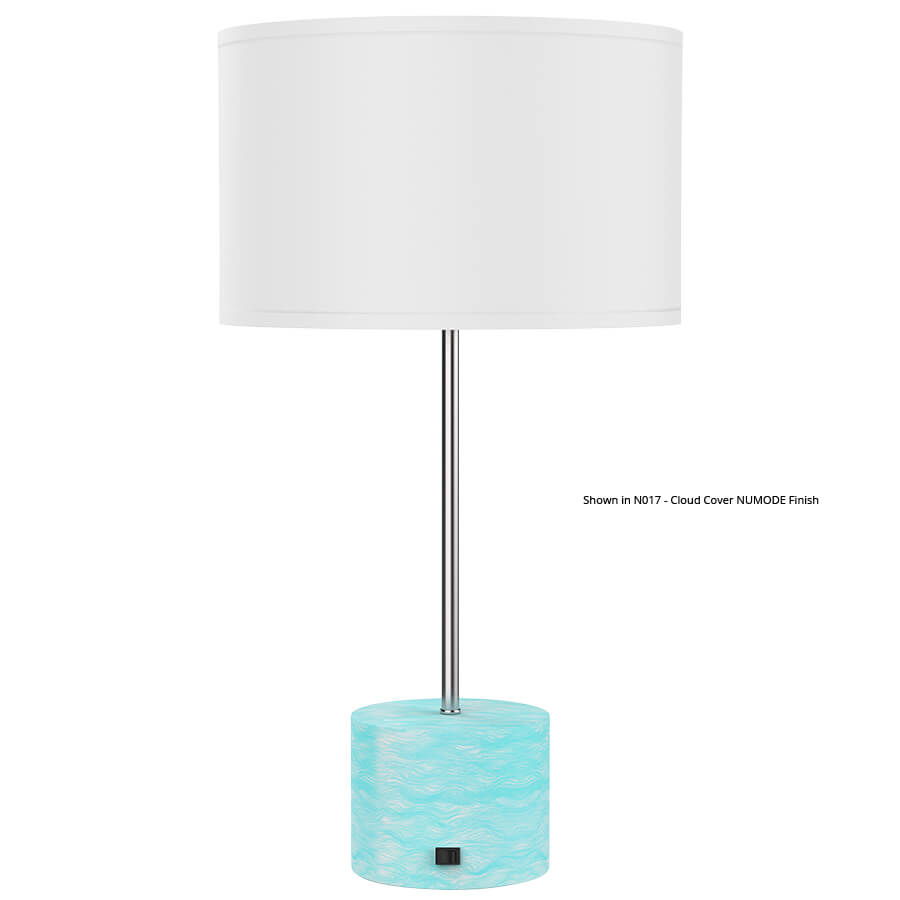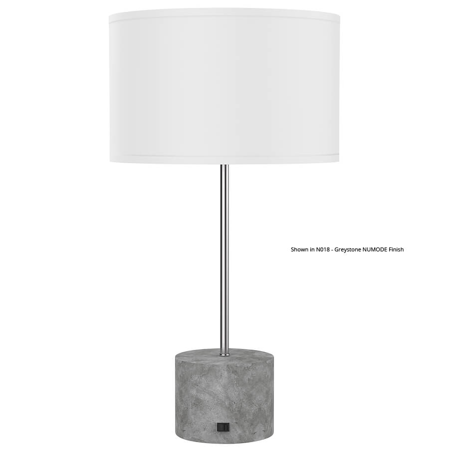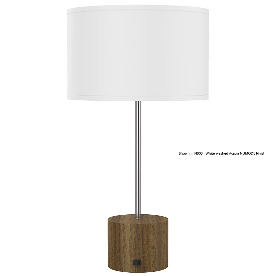 28.5" Brushed Nickel and White Washed Acacia Table Lamp, medium base socket, on/off rocker base switch, outlet, dual USB port, 8' Silver 45° Cord, 8"Harp & Finial, 16x16x10 White Linen Hardback Shade. Recommend 1100 lumen LED bulb (White Washed Acacia shown on base)