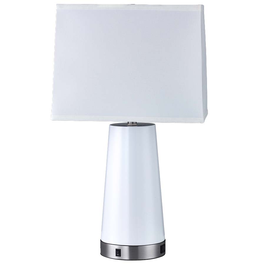 27" Monterey White Table Lamp with Brushed Nickel base, one GU24 socket, on/off rocker base switch, 1 outlet, Dual USB, 8' grounded silver cord w/flat plug and 45° offset, (9"x15") x(10"x16") x12" Rectangle Cream Linen hardback shade. Recommend 1100 lumen LED bulb with GU24 base