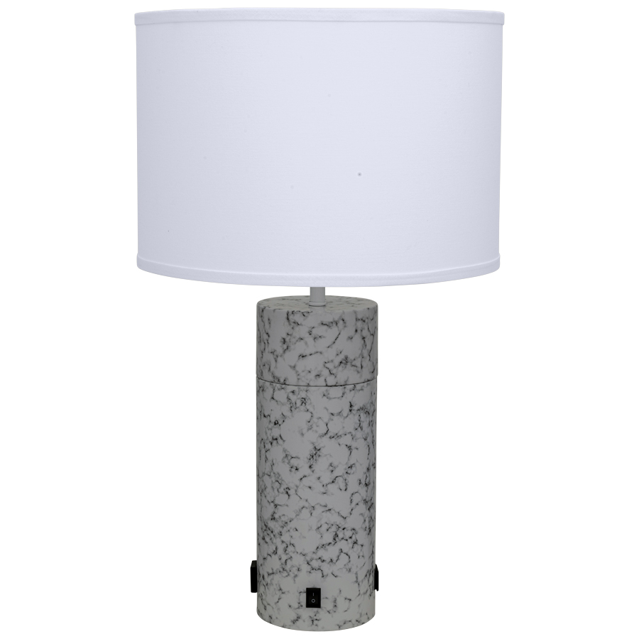 24.5"H Dalmatian Marble Numode Table Lamp, medium base socket, on/off rocker base switch, convenience outlet, dual USB port, 8' Silver 45° 3-prong grounded cord,15x15x10.5 White Linen HB Shade. Recommend 1100 lumen LED bulb.