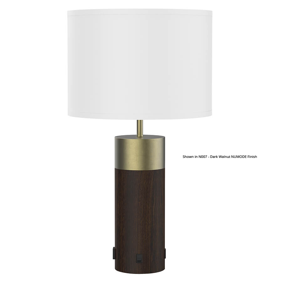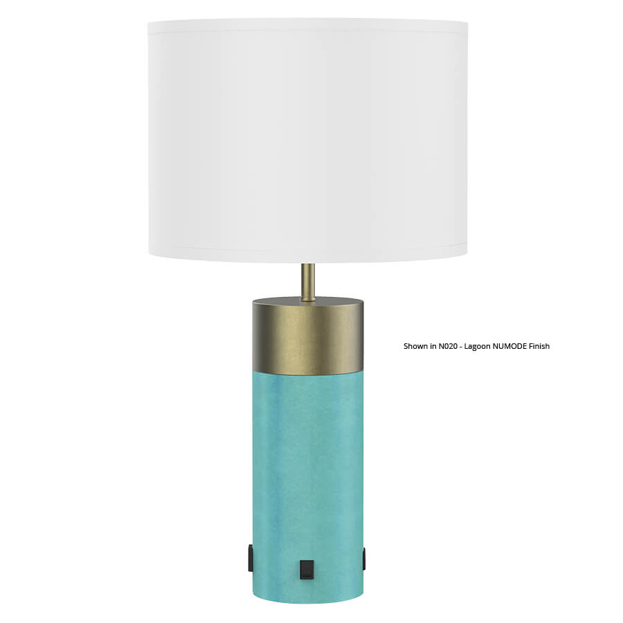 24.5"H PC Stainless Steel and Lagoon Numode Table Lamp, medium base socket, on/off rocker base switch, one outlet, dual USB port, 8' Silver 45° 3-prong grounded cord,15x15x10.5 White Linen HB Shade. Recommend 1100 lumen LED bulb. (Lagoon finish on bottom column) (Numode finish to be applied to bottom column only)