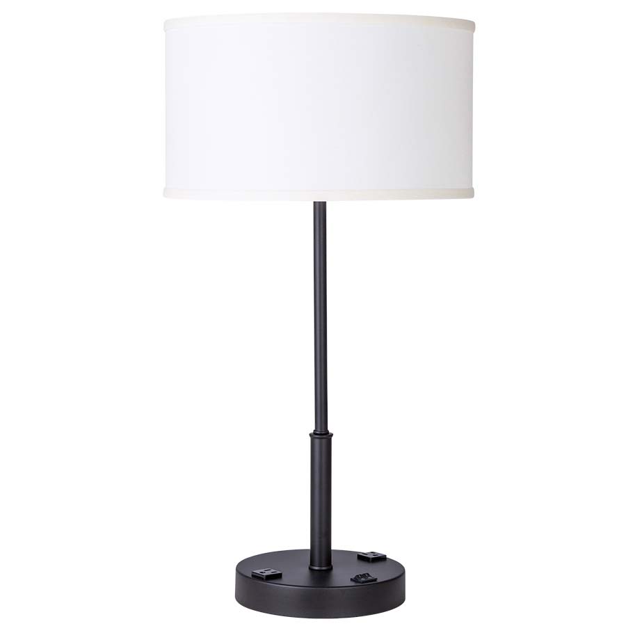 27"H Espresso Nightstand Lamp, medium base socket, on/off rocker switch at base, two convenience outlets, 8' Silver 45° 3-prong grounded cord, 14x14x8 Linda Parchment HB shade. Recommend 1100 lumen LED bulb. (Alt. # 6497EPC-CIS)