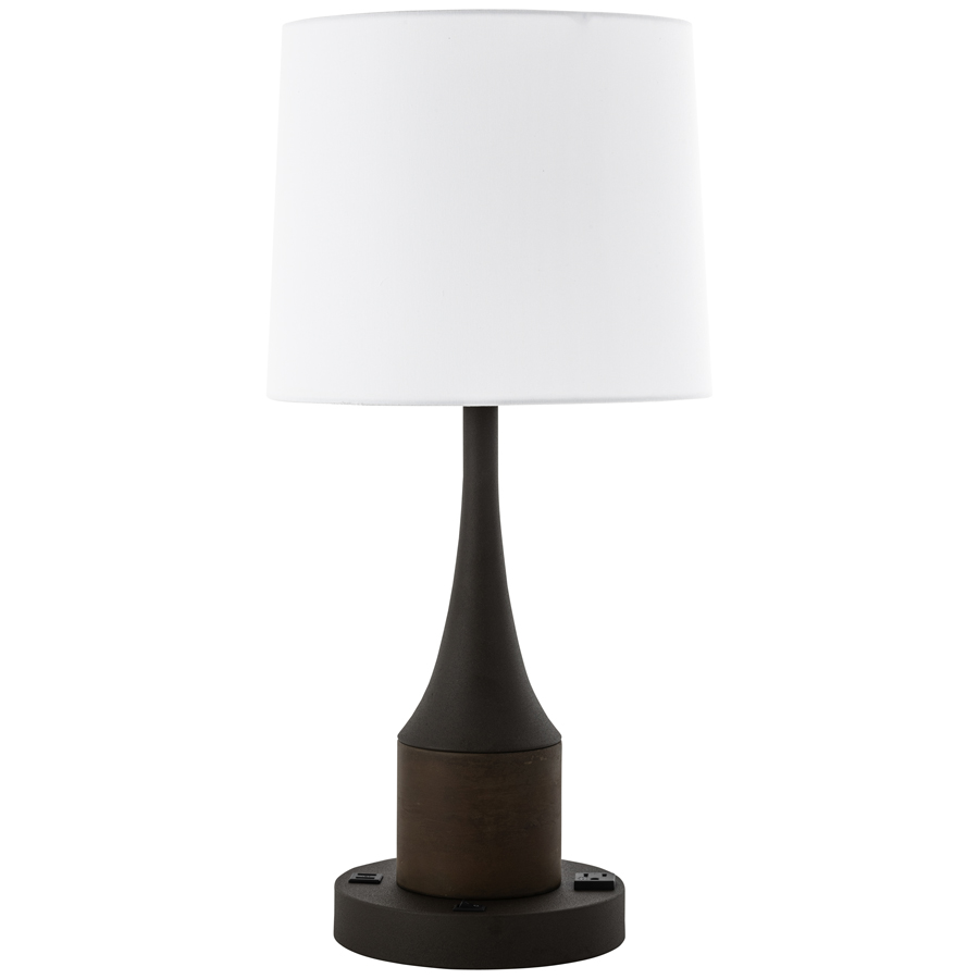 25" Hand Decorated Rust Red and Powder Coated Dark Rust Table Lamp, medium base socket, on/off rocker base switch, one outlet, dual USB port, 8' Silver 45° 3-prong grounded cord, 11x12x10 White Linen HB Shade with rolled edges. Recommend 1100 lumen LED bulb (Rust Red applied to bottom column)