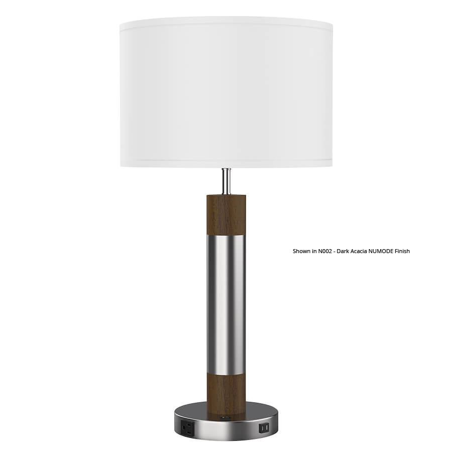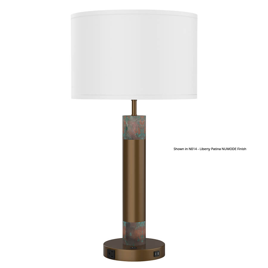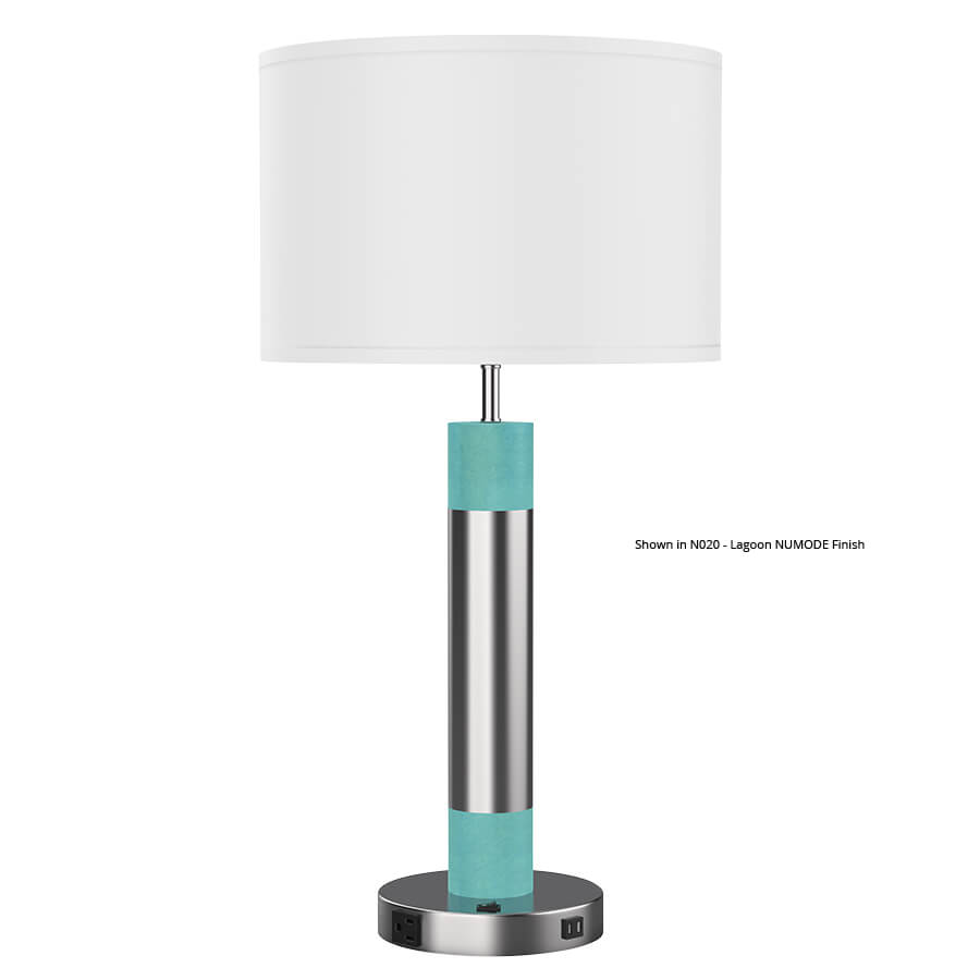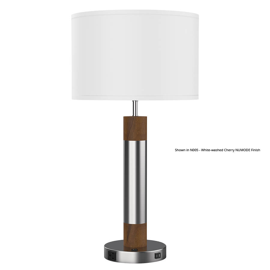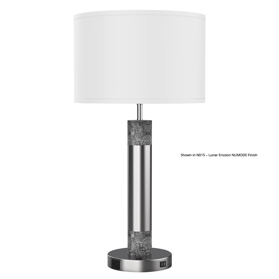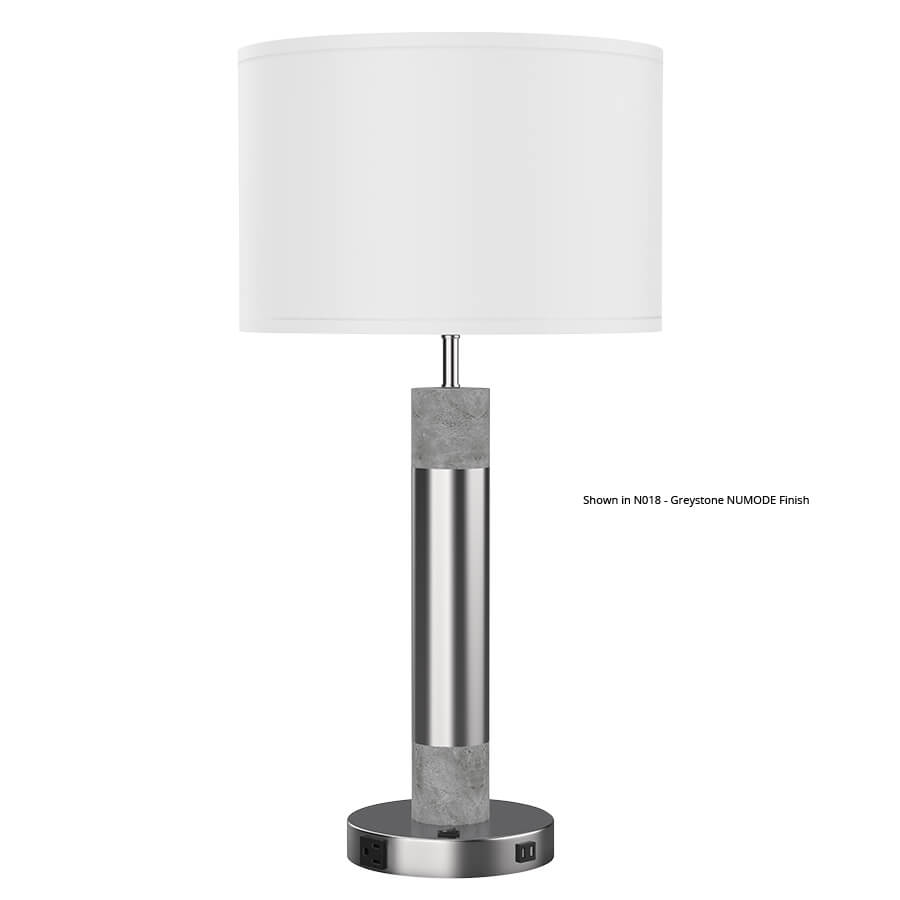 30"H Brushed Nickel and Greystone Numode Table Lamp, medium base socket, on/off rocker base switch, outlet, dual USB port, 8' Silver 45° cord, 16"x16"x10.5" White Linen Hardback Shade, recommend 1100 lumen LED bulb (Numode finish is shown on the two smaller columns, but can also be applied to the larger column)