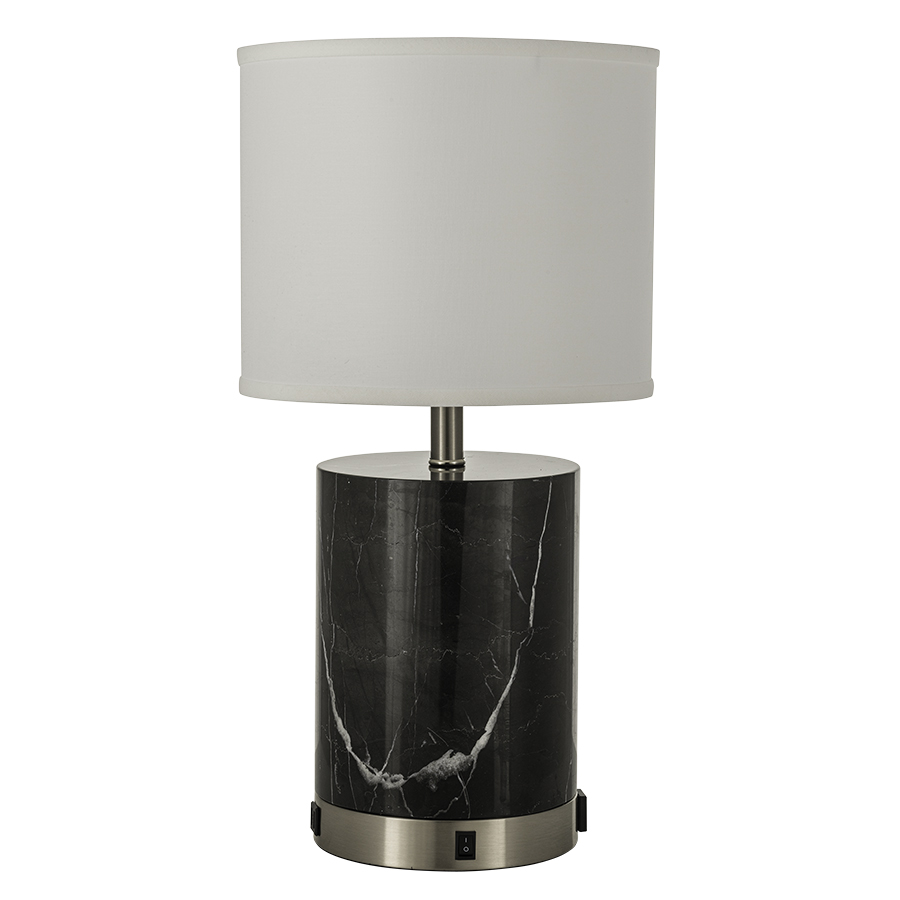 Black Marble Table Lamp with Brushed Nickel base, medium base socket,1 Convenience Outlet, 1 dual USB port, rocker switch on base, 8' Silver 45° 3-prong Grounded Cord, with 12"x12"x10" White Linen Hardback Shade, recommend 1100 lumen LED bulb