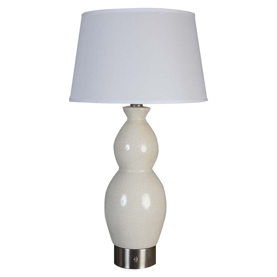 29.5" Eggshell Crackle and Brushed Nickel Table Lamp, medium base socket, on/off push button base switch, 8' Silver 45° cord, with 13"x16"x10" Cream Linen Hardback Shade. Recommend 1100 lumen LED bulb.