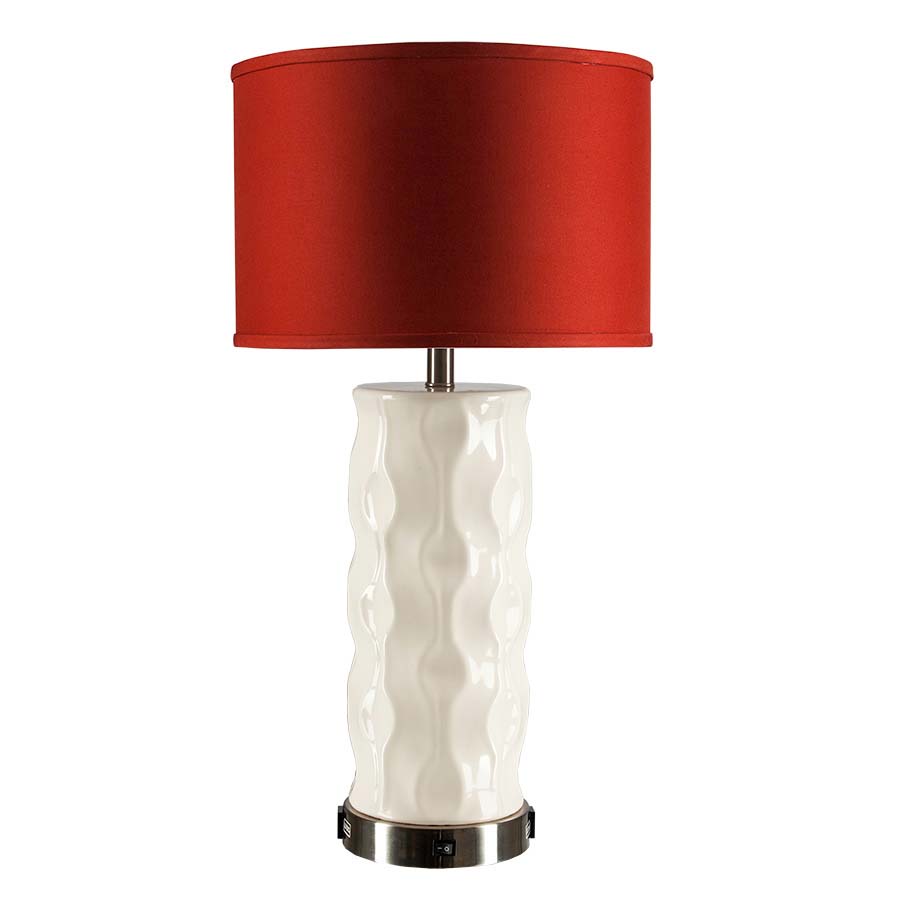 28.75"H Eggshell and Brushed Nickel Table Lamp, medium base socket, on/off rocker base switch,two outlets, 8' Silver 45° 3-prong grounded cord, with 15"x15"x10" Paprika Hardback Shade, recommend 1100 lumen LED bulb