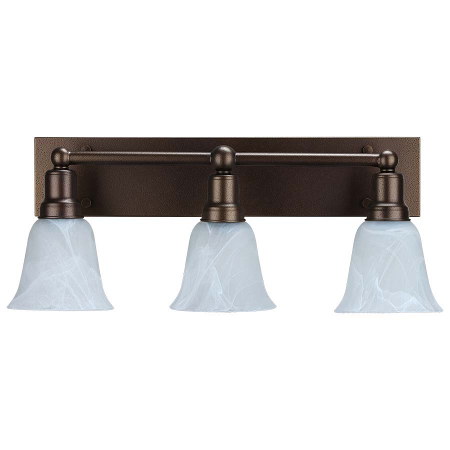 Liberty Bronze Three Light Vanity Fixture, 3 medium base sockets, 24"W, 9.5"H, with White Swirl Glass Diffusers. Recommend three 800 lumen LED bulbs.