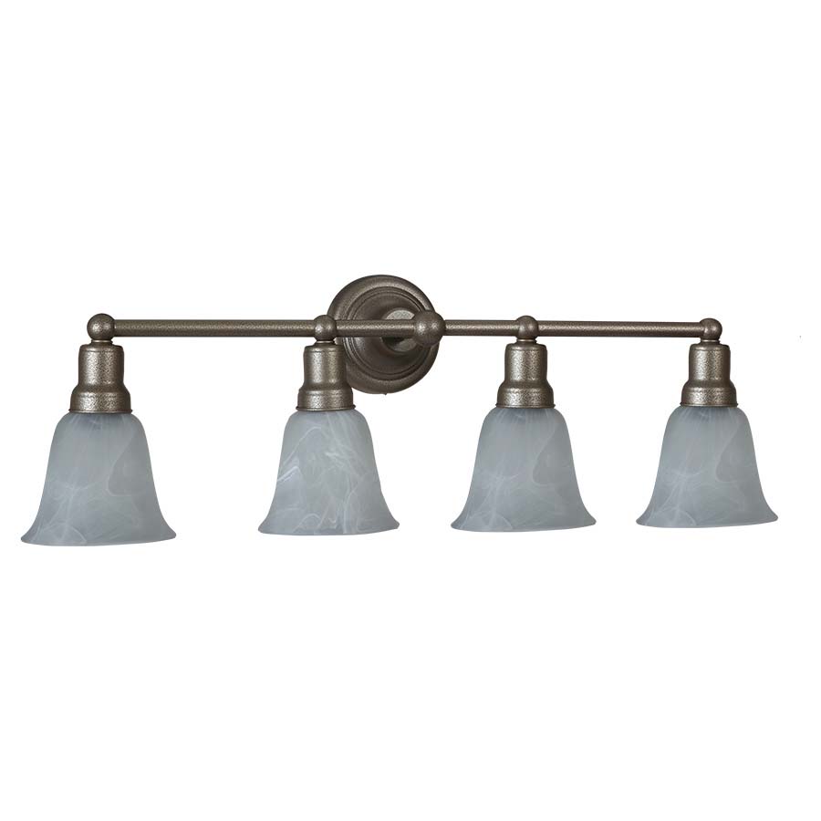 Four Light Vanity Fixture, four medium base sockets, direct wired, 32.75"W, 12"H in Silver Gold with White Swirl Glass Diffusers. Recommend four 800 lumen LED bulbs.