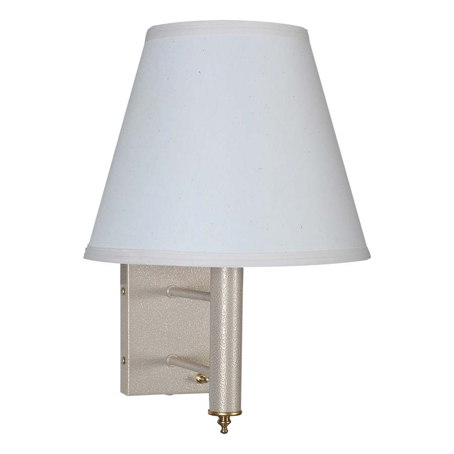 15.5"H Metallic Silver Single Wall Lamp, on/off push button switch at backplate, 8' Silver 45° cord, 24" matching cord cover. Includes 6"x11"x9" Natural Linen Hardback Shade. 11"W, 15.5"H. Recommend 1100 lumen LED bulb. (finish not shown in picture)