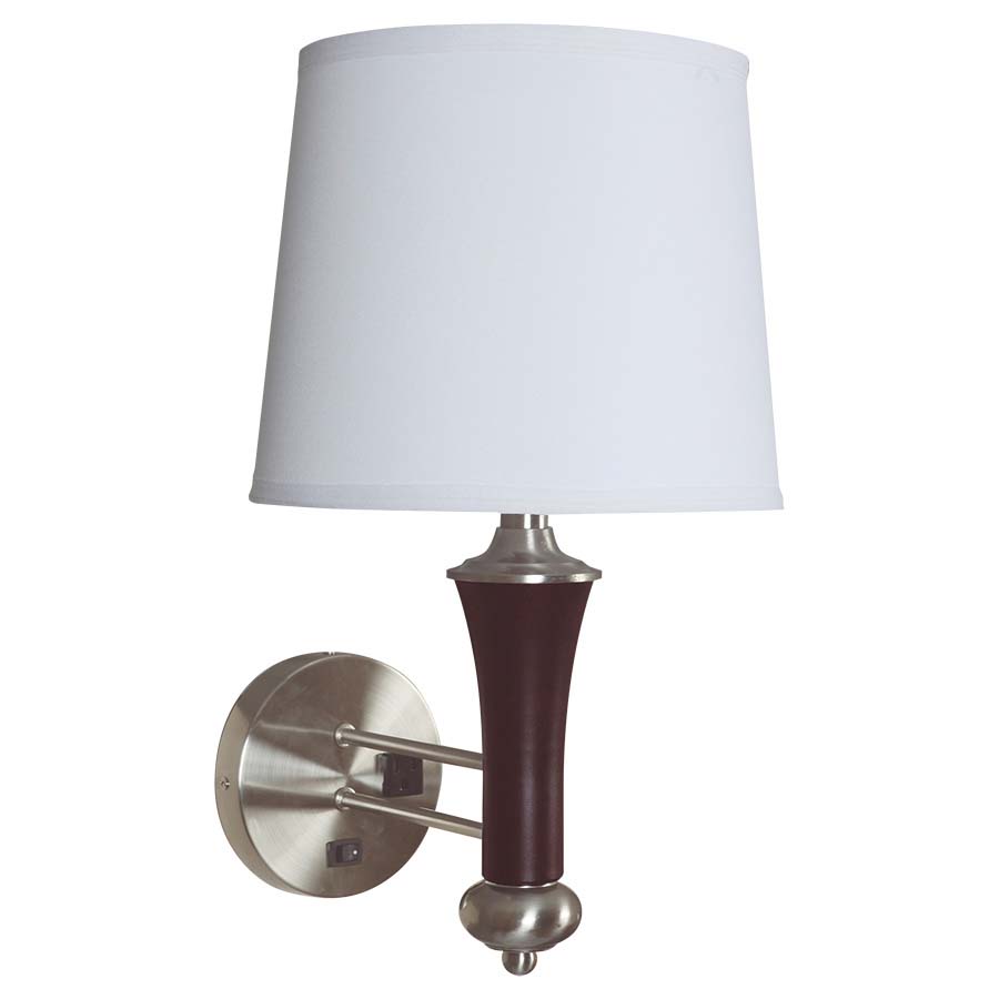 19"H Single Wall Lamp shown in Brushed Nickel and Dakota Mahogany, medium base skt, on/off rocker switch at backplate, 8' Silver 45°3-prg grounded cord, one outlet, 24" matching cord cover. Includes 9"x11"x9" White Linen HB Shade. 19" H. Recommend 1100 lumen LED bulb.