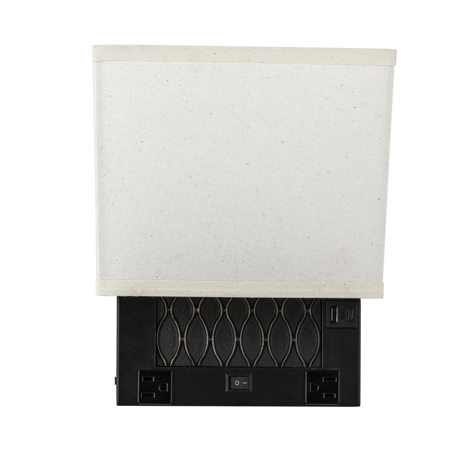 11.75"H Portland Bronze Single Wall Lamp, GU24 socket, on/off rocker switch at backplate, two outlets, Dual USB A+C Port 8' Cord exiting out bottom of fixture with 24" Portland Bronze Cord Cover, 4x8.5x5x9x7.5 Natural Linen Shade. Recommend 1100 lumen LED bulb with GU24 base